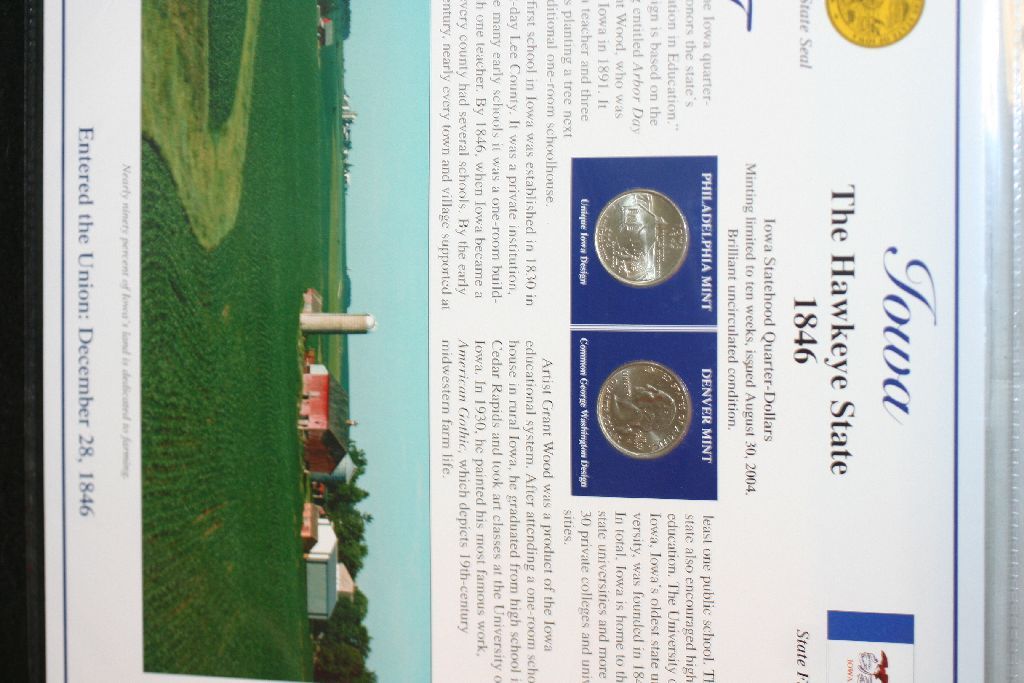 2004 Iowa State Quarter Set W/Postal Stamps Commerating Centennial of Iowa Statehood & 150th Anniversary of Lewis & Clark Expedition; P&D Mints