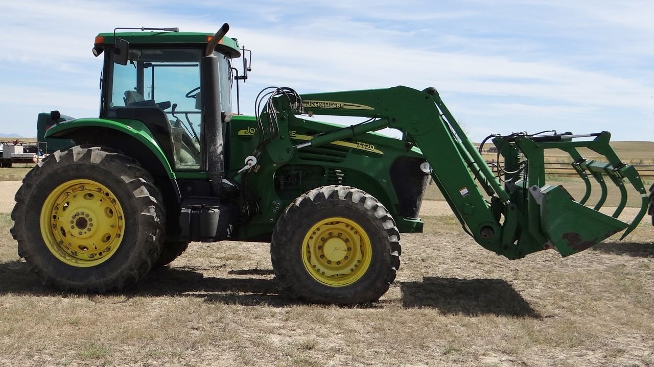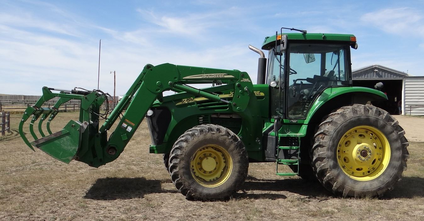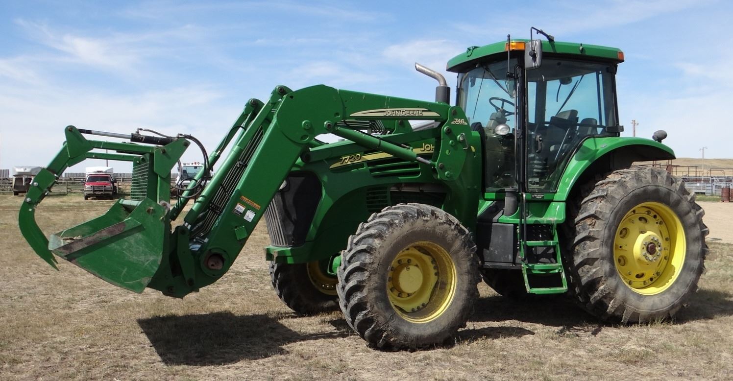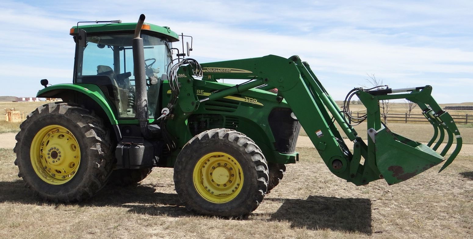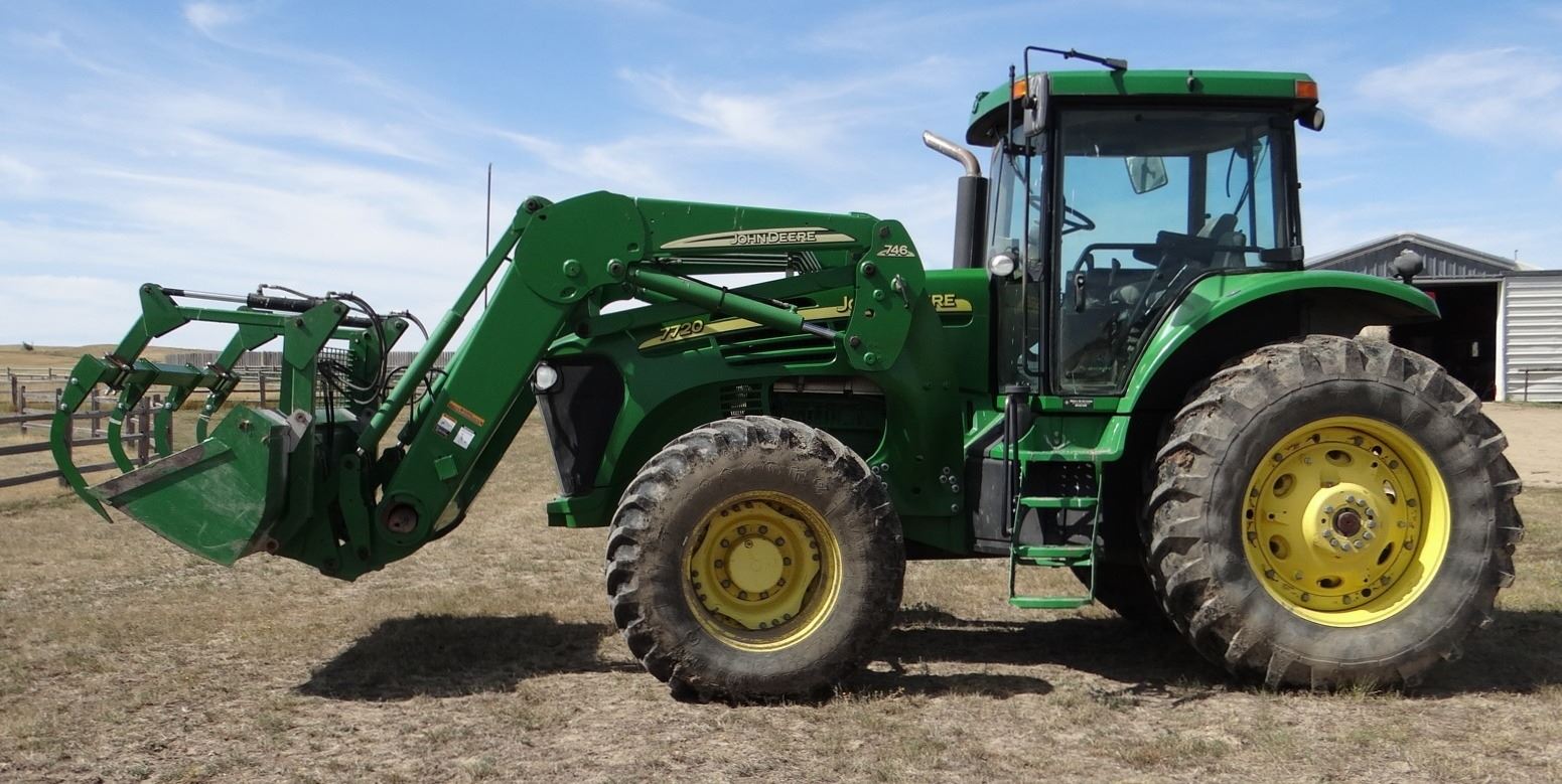 2004 JD 7720 w/ JD 746 loader, 8’ bucket/grapple, 7899 hrs., 6.8L diesel, no DEF, 182 eng hp/140 pto hp, PowrQuad Plus – 16 f/r, 3 hyd., 3pt., dual pto, CAH, rears 520/85R38 50%, fronts 420/85R28 Serial #RW7720R020313X
