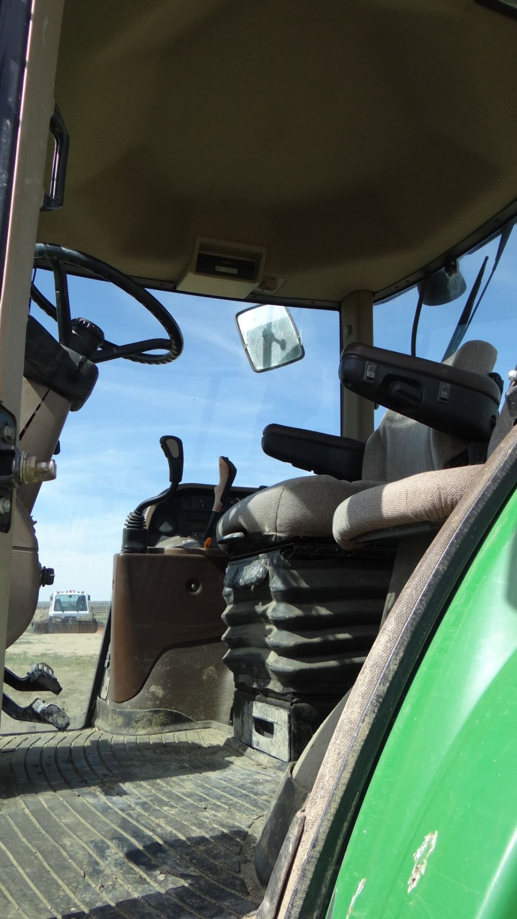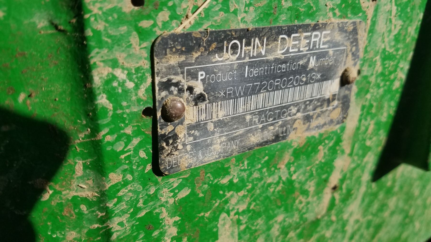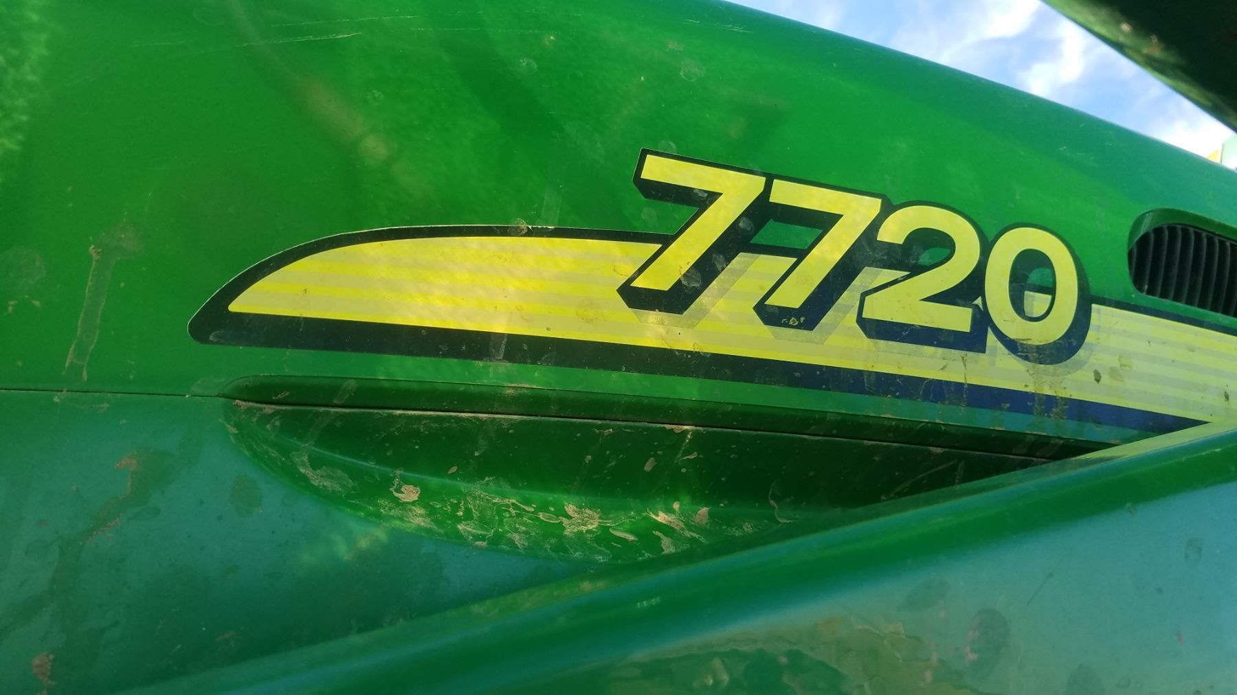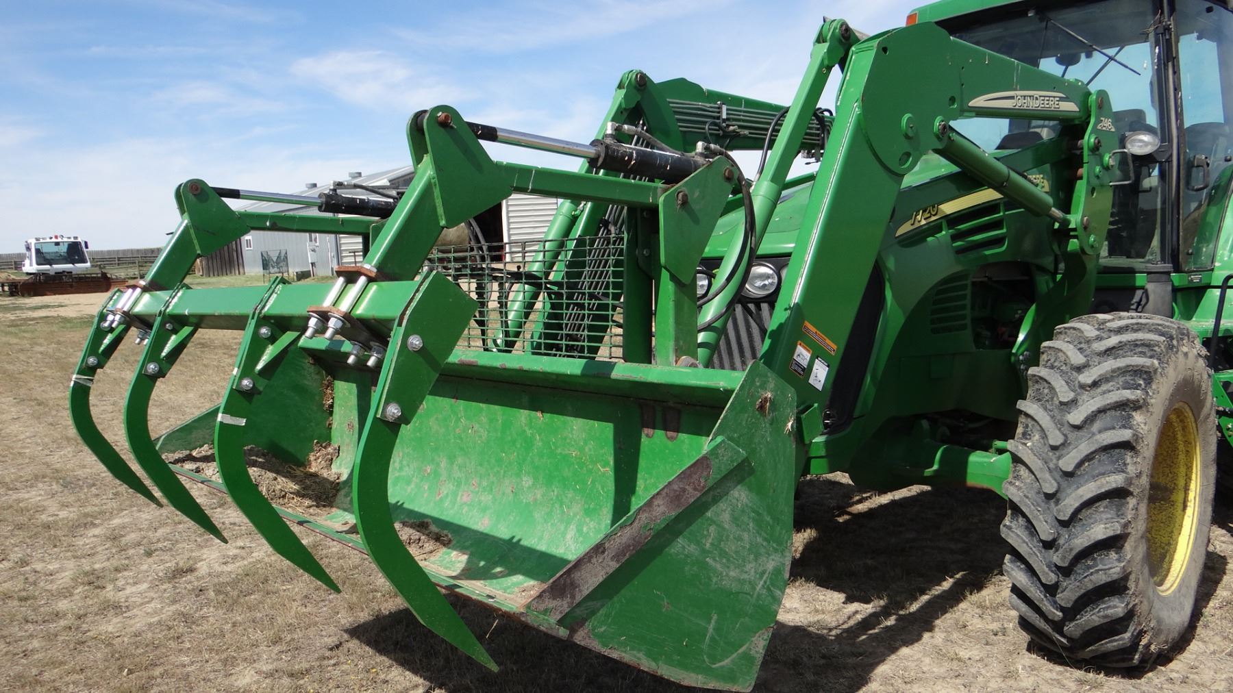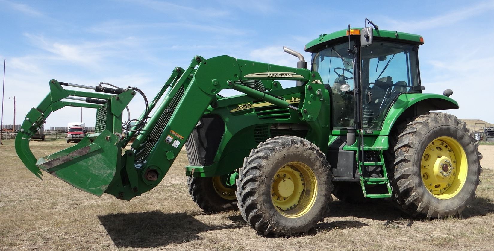 2004 JD 7720 w/ JD 746 loader, 8’ bucket/grapple, 7899 hrs., 6.8L diesel, no DEF, 182 eng hp/140 pto hp, PowrQuad Plus – 16 f/r, 3 hyd., 3pt., dual pto, CAH, rears 520/85R38 50%, fronts 420/85R28 Serial #RW7720R020313X
