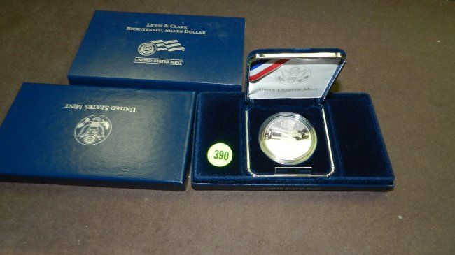 2004 LEWIS AND CLARK BICENTENNIAL COMMEMORATIVE SILVER 1.00 DOLLAR w/BOX & COA