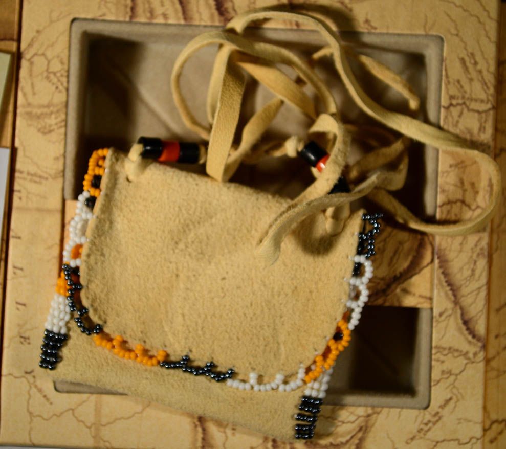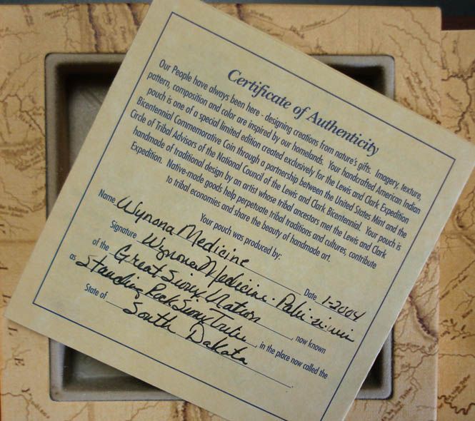 THIS SET CONTAINS A 2004 LEWIS AND CLARK PROOF COMMEMORATIVE SILVER DOLLAR AND A ONE OF A KIND NATIVE AMERICAN MADE LEATHER POUCH, POUCH MADE BY WYNONA MEDICINE OF THE GREAT SIOUX NATION FROM SOUTH DAKOTA, EST. $80.00 TO $85.00