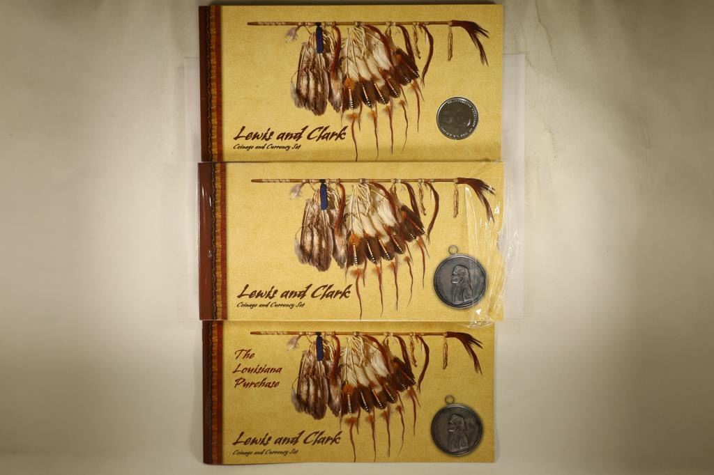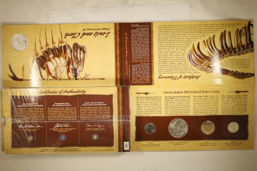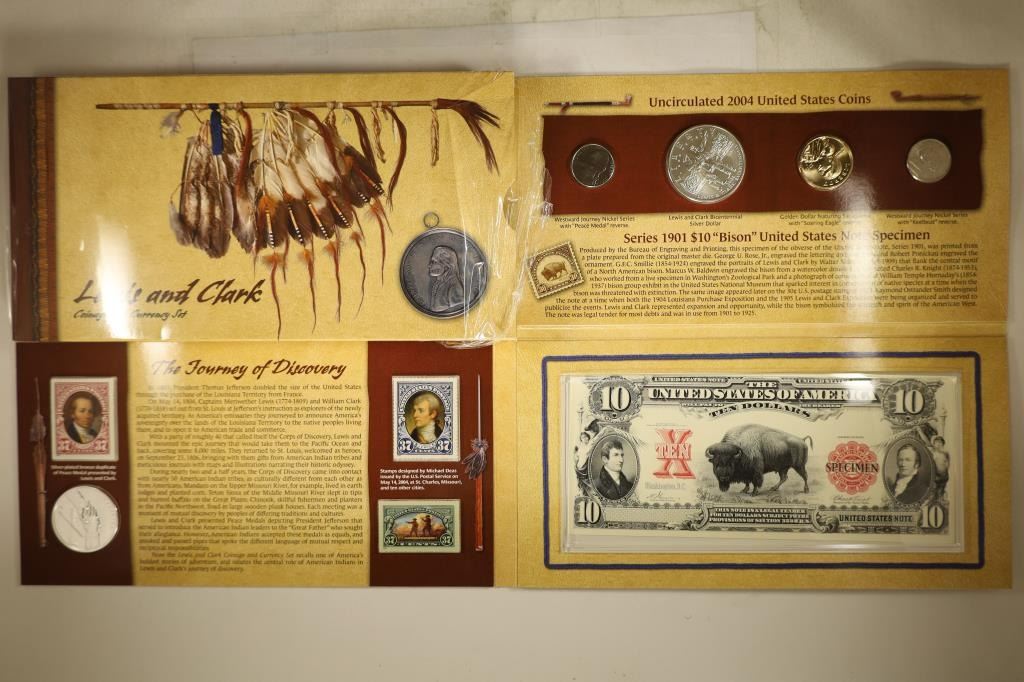 CONTAINS: SILVER DOLLAR, SACAGAWEA DOLLAR, 2-WESTWARD JOURNEY NICKELS, MEDAL, 3 STAMPS AND A SERIES 1901 $10 BISON US NOTE SPECIMEN, ORIGINAL MINT PACKAGING