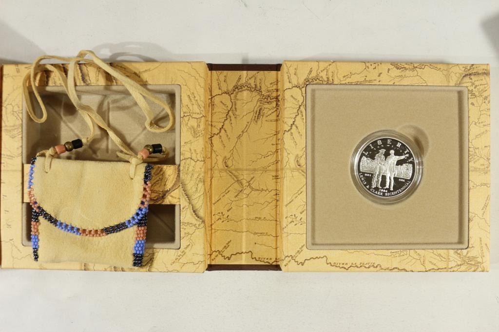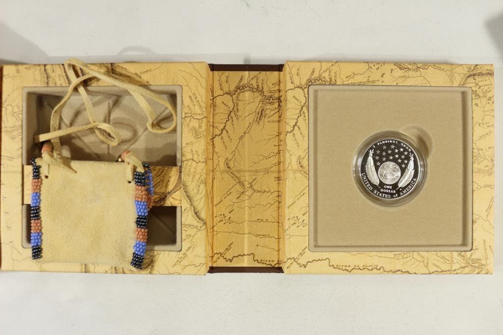 SET CONTAINS: PF SILVER DOLLAR AND INDIAN POUCH MADE BY WYNOMA MEDICINE OF THE GREAT SIOUX NATION, ORIGINAL US MINT PACKAGING