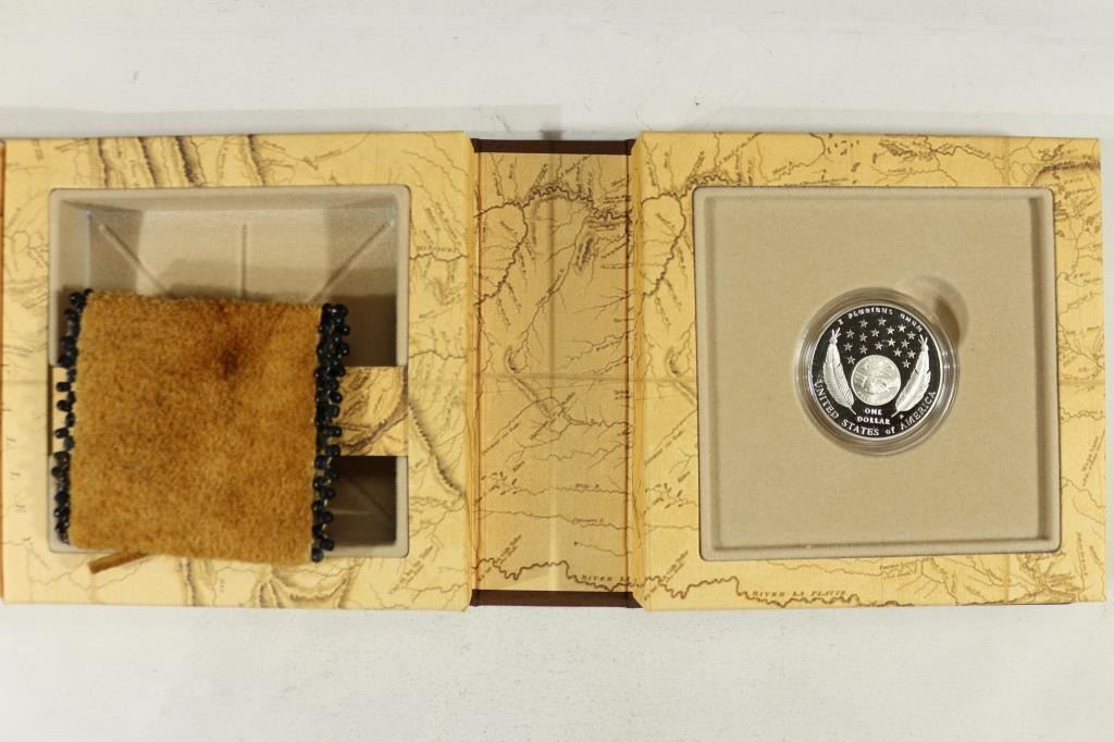 SET, CONTAINS: 2004-P PROOF SILVER DOLLAR AND AMERICAN INDIAN POUCH MADE BY APRIL FOX OF THE 3 AFFILIATED TRIBES, ORIGINAL US MINT PACKAGING