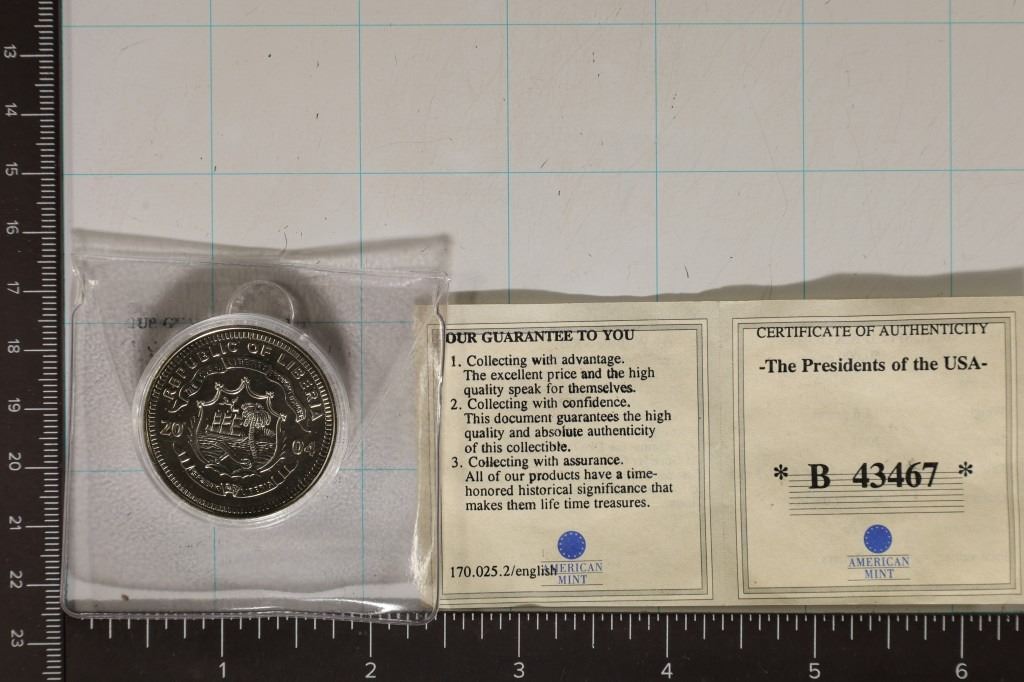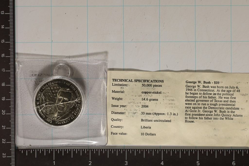 COIN. GEORGE W. BUSH IN HARD PLASTIC CAPSULE WITH CERT FROM THE AMERICAN MINT, CAPSULE IS CRACKED