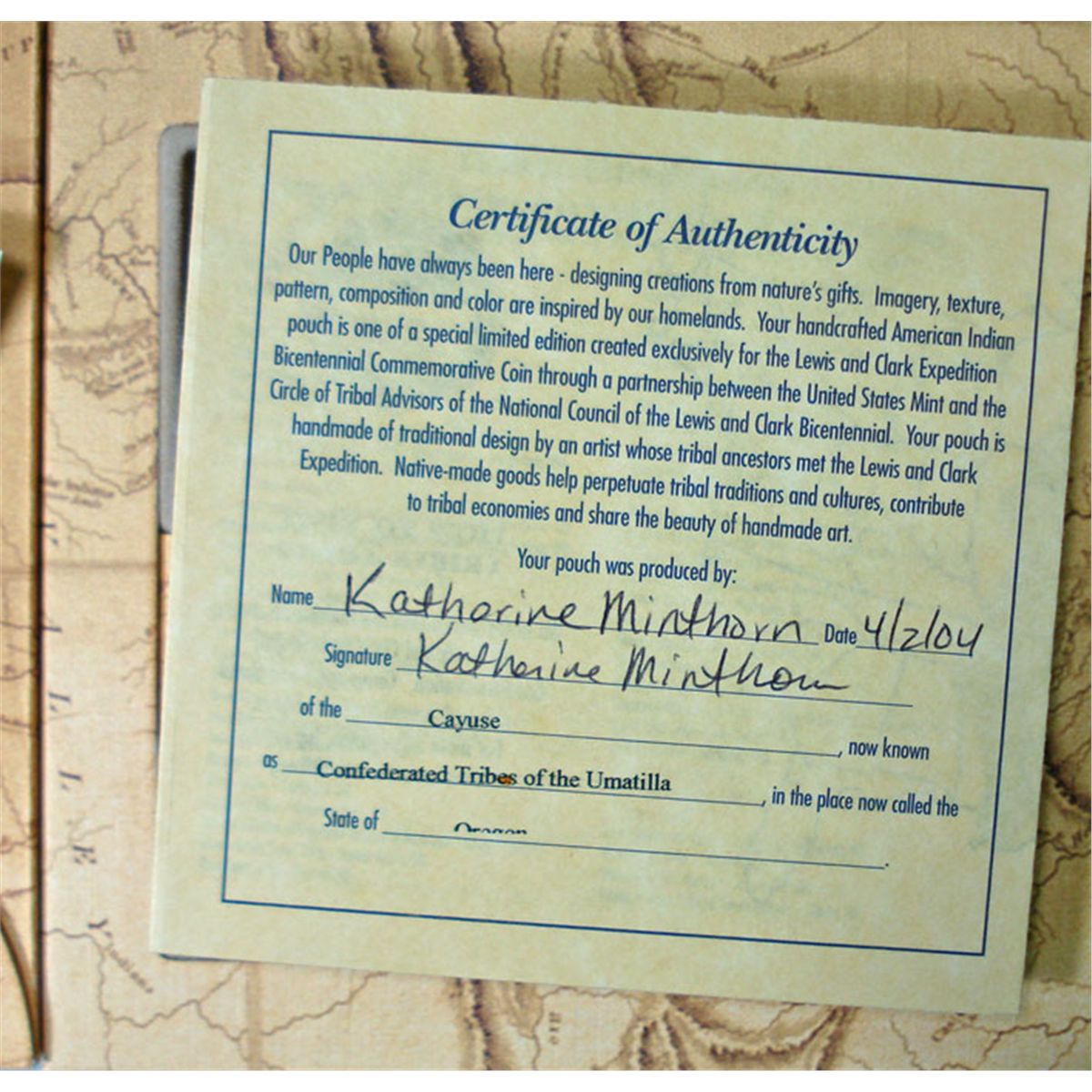 Set includes: silver dollar and a one of a kind Native American pouch. Pouch made by Katherine Minthon of the Cayuse now known as Confederated Tribes of the Umatilla