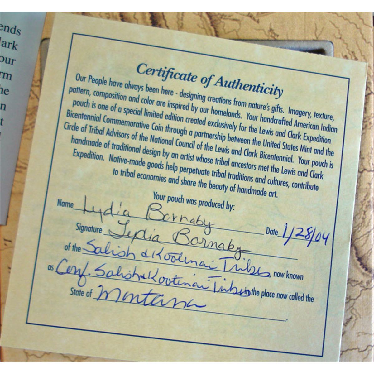Set includes: silver dollar and a one of a kind Native American pouch. Pouch made by Lydia Barnaby of the Salish and Kootenai Tribes now known as the Confederated Salish and Kootenai Tribes of Montana