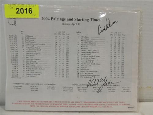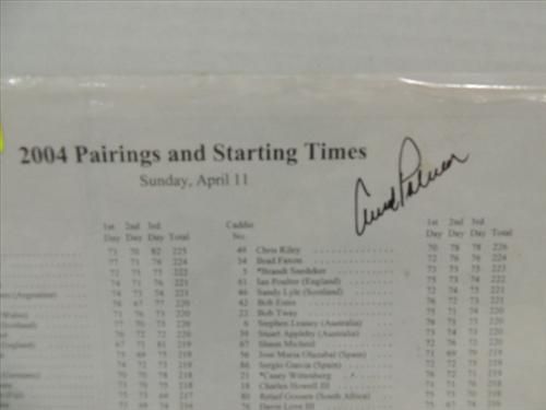 2004 MASTERS PAIRINGS LIST AUTOGRAPH ARNOLD PALMER. INCLUDES A COA FROM PRIMETIME COLLECTIONS #K370269. AS SHOWN. VIEW PICTURE FOR DETAIL. PLEASE BE ADVISED, AND INFORMED REGARDING SIGNATURES OR AUTOGRAPHS THAT WE SELL AT AUCTION: WE ARE NOT AUTHENTICATORS, AND WE DO NOT AUTHENTICATE, OR VALIDATE ANY AUTOGRAPHS OR SIGNATURES THAT WE OFFER AT AUCTION. SOME AUTOGRAPHS OR SIGNATURES MAY COME WITH AN AUTHENTICATION FROM ANY ONE OF LITERALLY HUNDREDS OF AUTHENTICATORS ACROSS THE COUNTRY, AND AROUND THE WORLD. WE DO NOT ENDORSE ANY AUTHENTICATOR, NOR DO WE GUARANTEE THAT ANY AUTOGRAPH OR SIGNATURE IS AUTHENTIC, OR THAT IT WILL PASS AUTHENTICATION BY ANY AUTHENTICATOR. ALL AUTOGRAPHS OR SIGNATURES ARE SOLD