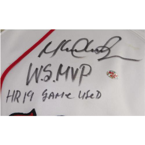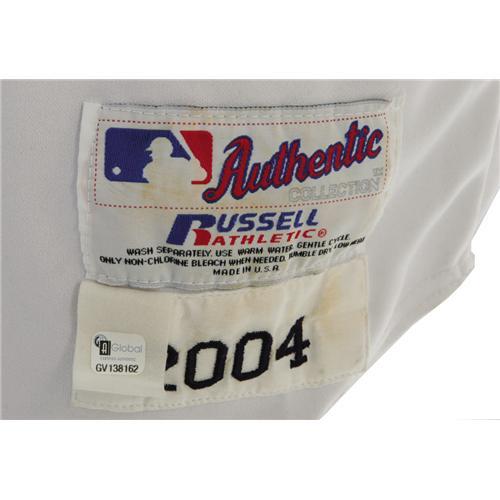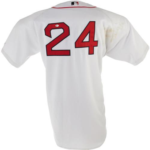 <B>2004 Manny Ramirez 19th Home Run Game Worn Jersey.</B></I> No true Fenway fanatic could possibly resist the opportunity to own a gamer from the incredible Curse-breaking season of 2004, particularly one from this future Hall of Fame superstar. But this one is even better, worn by Manny as he crushed his nineteenth homer of the Championship season, and the 366th of his career. The home white gamer offers classic Old English "Red Sox" arching across chest, with number "24" taking up the rear. "Russell Athletic Authentic Collection" label in tail is sewn above custom "2004" embroidered label. The odd tagging, and the extra long sleeves that are typical of Ramirez gamers, are likely due to the fact that Ramirez custom orders his jerseys independent of the club. The extra wide girth is also apropos of Manny exemplars. A perfect black sharpie signature on upper chest is notated in Ramirez' hand, "W.S. MVP, HR 19 Game Used." The jersey shows acceptable wear with significant infield dirt staining. Artifacts from the 2004 Red Sox will always be held sacred in the hearts of New England sports fans, so the wise investor chases every significant piece he can find. Acquired from Ramirez' personal marketing company, with his authenticating holographic sticker. <I>LOA from Lou Lampson. LOA from James Spence Authentication. LOA from PSA/DNA.</B></I><BR><BR><b>Shipping:</b> Clothing, Costumes & Jerseys (<a target="_blank" href="http://www.heritageauctions.com/common/shipping.php">view shipping information</a>)