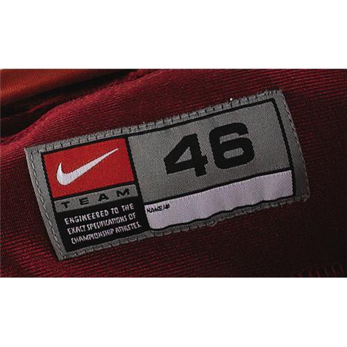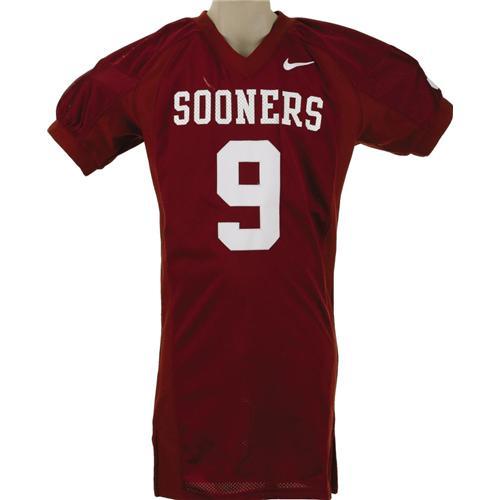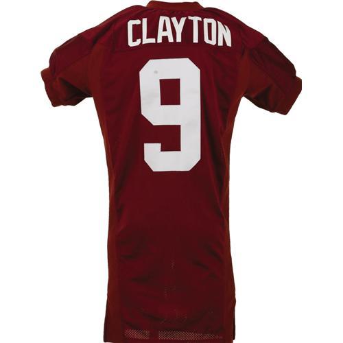 <B>2004 Mark Clayton Game Worn Oklahoma University Jersey.</B></I> A top draft pick for the Baltimore Ravens, Clayton sported this red mesh jersey during the Sooners' Championship run, one in which he helped deliver the Heisman to his quarterback Jason White. The team nickname on front, and Clayton's surname on back, are screened in white, while the number "9" is sewn to chest, back and shoulders in white tackle twill. Nike "swoosh" is found on upper left chest, matching the size "46" label inside the collar. In terms of wear and customization, this jersey scores a ten. Both spandex side panels have been hemmed for a snug fit, a feature easy to spot in photo matches. Visible helmet dings appear on the dazzle cloth shoulders, and three team repairs can be counted. <I>LOA from Lou Lampson.</B></I> <BR><BR><B>Important notice:</B> Heritage usually auctions material at the rate of 200-250 lots per hour. On some occasions eBay Live bid software or the Internet may not be able to keep up with the pace of the auction. We recommend placing a realistic absentee bid now as insurance to avoid disappointment. Occasionally the auctioneer may eliminate or reject an eBay Live bid, and the auctioneer may also reopen a lot after the close of the eBay live bidding (usually because we missed an audience bid), and may reject your bid even if it shows you as the winning bidder. By bidding via eBay Live, you agree that Heritage may award the lot to another bidder at its sole discretion under the circumstances described above or any other reasonable circumstances. Since eBay bids are not shown to us until we open the lot on the floor, we treat those bids just like floor bids. In most cases the floor responds before the eBay bid is presented to us, due to Internet lag time, so for consistency we have made it a policy that floor bids are always considered first over tie eBay live bids. Also please note that all Heritage lots purchased through eBay Live carry a 22.5% Buyer's Premium. Please make sure you read the Terms and Conditions before you bid. This lot is being auctioned in conjunction with a live floor auction by Heritage Galleries & Auctioneers. All final auction and invoice information will be supplied by Heritage Galleries & Auctioneers, and all other information should be considered preliminary. Lot:19332 <BR><BR><B>Winning Notification and Billing:</B> After the FINAL session in this auction is complete, Heritage will send e-mail and snail mail invoices. This process normally takes several days. All final auction and invoice information will be supplied by Heritage Galleries & Auctioneers, and all other information should be considered preliminary. <BR><BR>This auction will be conducted on a live auction floor and over the Internet through eBay Live. If you choose to place an absentee bid, please take a moment to <font color='#0000ff'><u><a href='http://pages.ebay.com/liveauctions/help/before/laabsentee.html'>learn how eBay Live absentee bidding works</a></u></font><font color='#000000'>