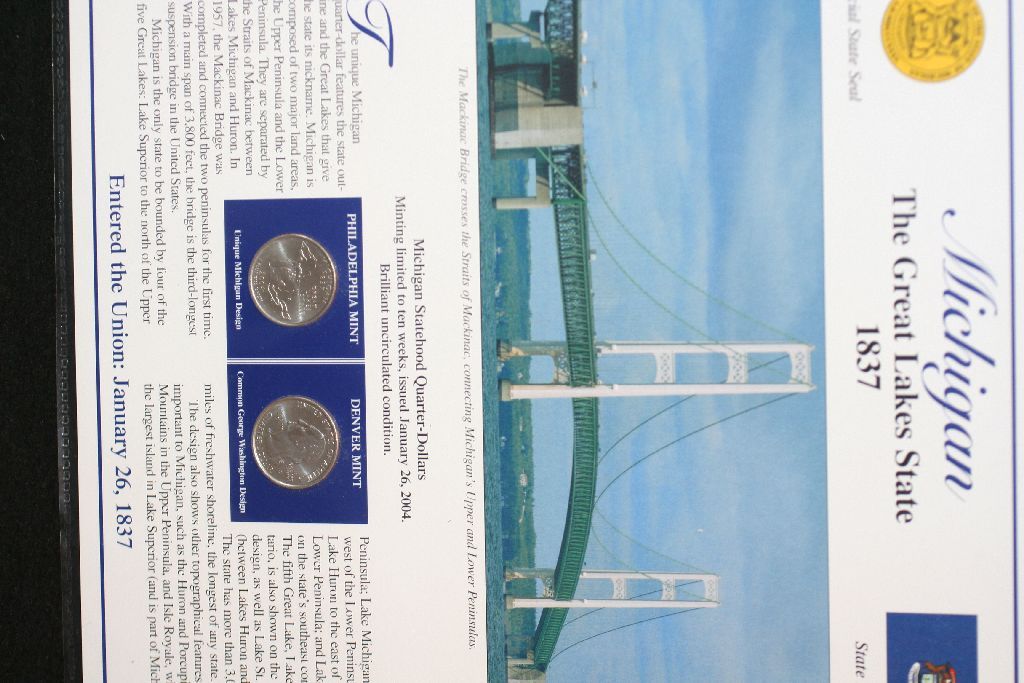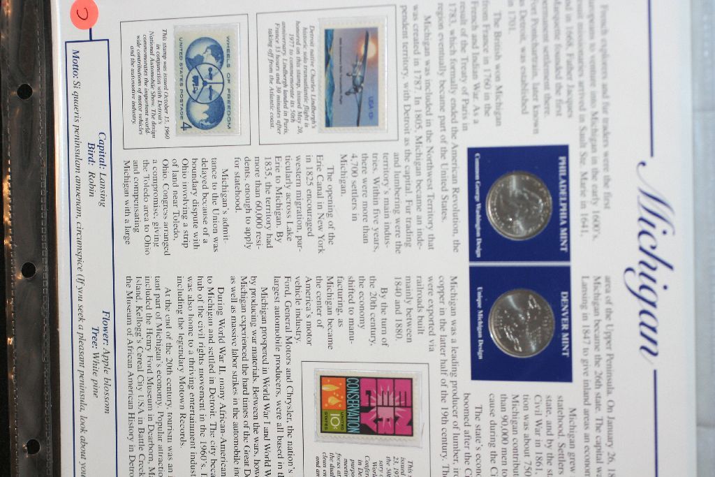 2004 Michigan State Quarter Set W/Postal Stamps Commerating Lindbergh's solo Transatlantic Flight, Detroit's Nat'l Auto Show & World Energy Conference; P&D Mints