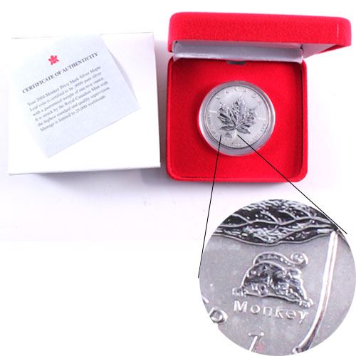 2004 Monkey Privy Mark 1oz. Silver Maple Leaf. Comes encapsulated in a red velvet case with COA. Please note that coin is lightly toned. (TAX Exempt)