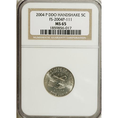 <B>2004-P 5C Double Die Obverse Peace Medal MS65 NGC.</B></I> FS-2004P-111.NGC Census: (16/323). PCGS Population (281/188). Numismedia Wsl. Price: $3.50. (#4154)<BR><BR><b>Shipping:</b> Coins & Currency (<a target="_blank" href="http://www.heritageauctions.com/common/shipping.php">view shipping information</a>)