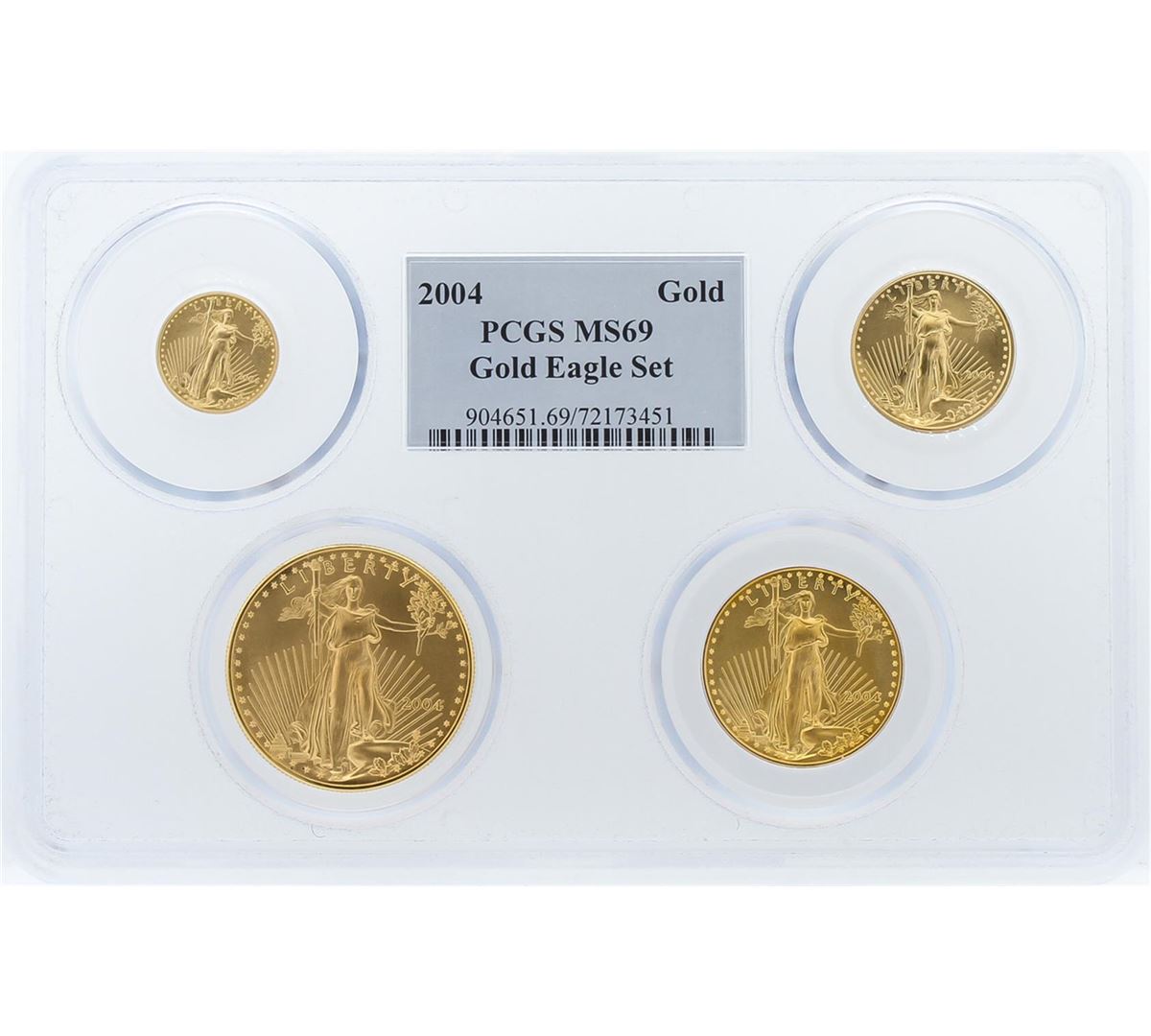 One 2004 PCGS MS69 American Eagle Gold Bullion Coin Set featuring: 2004 $5 Tenth-Ounce American Eagle Gold Coin; 2004 $10 Quarter-Ounce American Eagle Gold Coin; 2004 $25 Half-Ounce American Eagle Gold Coin; $50 One-Ounce American Eagle Gold Coin. PCGS Certified.