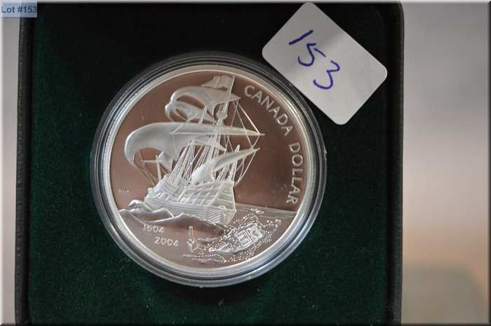 2004 Proof silver dollar Pursuit of the New world commemorating the 400th anniversary of French settlement in North America, with original sleeve