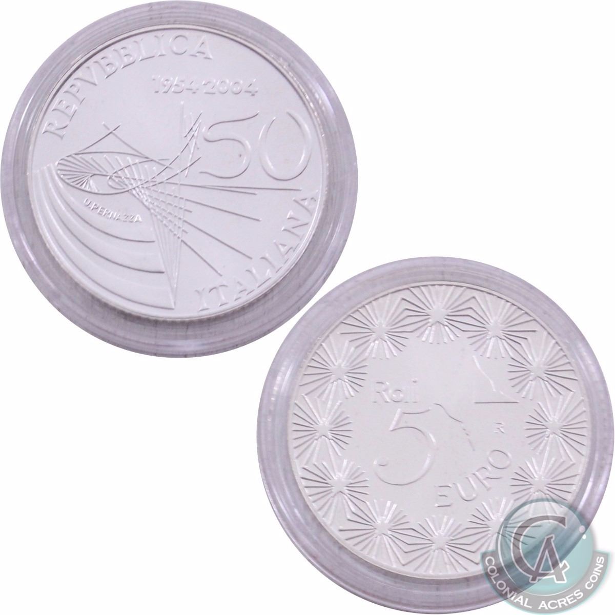 2004 Republic of Italy 5 Euro 50th anniversary of Italian Television Silver Coin. This coin weighs 18 grams and contains 0.5353 oz of pure Silver (KM # 254)