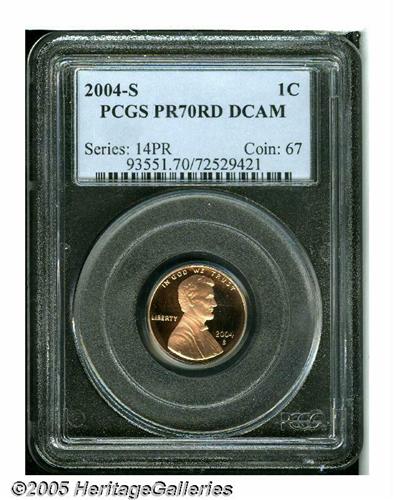 <B>2004-S<1C> PR70 Deep Cameo PCGS.</B></I> An outstanding pumpkin-gold modern proof Lincoln Cent. The contrast between the devices and fields is unimprovable. Population: 33 in 70 (5/05).
