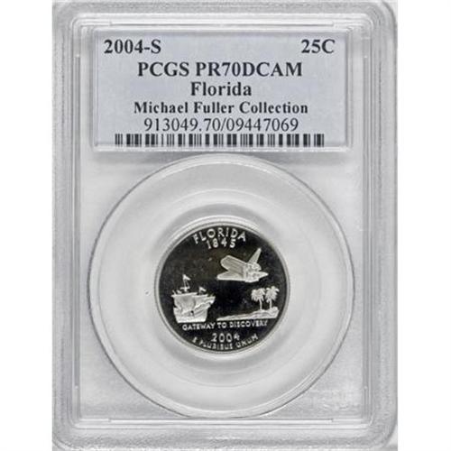 <B>2004-S 25C Florida Clad PR70 Deep Cameo PCGS.</B></I> Michael Fuller Collection. PCGS Population (80/0). NGC Census: (0/0). Numismedia Wsl. Price for NGC/PCGS coin in PR70: $110. (#913049)<BR><BR><b>Shipping:</b> Coins & Currency (<a target="_blank" href="http://www.heritageauctions.com/common/shipping.php">view shipping information</a>)
