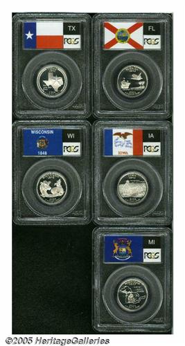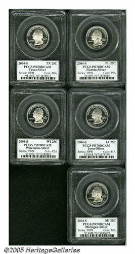 <B>2004-S<25C> Silver Statehood Quarter Set PR70 Deep Cameo PCGS.</B></I> The states include Michigan, Florida, Texas, Iowa, and Wisconsin. Alas, the latter has no extra leaves. All coins are brilliant and flawless and housed in Flag holders.<BR><I>From The Western Hills Collection.</B></I>