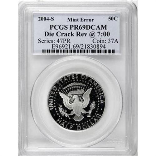 <B>2004-S 50C Silver Kennedy Half Dollar--Die Crack Reverse at 7:00--PR69 Deep Cameo PCGS.</B></I> <BR><BR><b>Shipping:</b> Coins & Currency (<a target="_blank" href="http://www.heritageauctions.com/common/shipping.php">view shipping information</a>)
