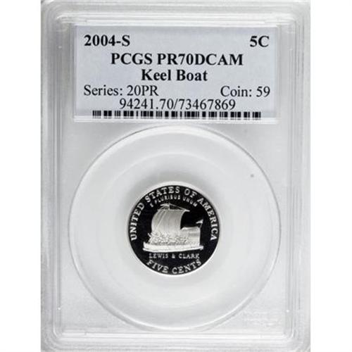 <B>2004-S 5C Keel Boat PR70 Deep Cameo PCGS.</B></I> PCGS Population (233/0). NGC Census: (0/0). Numismedia Wsl. Price for NGC/PCGS coin in PR70: $85. (#94241)<BR><BR><b>Shipping:</b> Coins & Currency (<a target="_blank" href="http://www.heritageauctions.com/common/shipping.php">view shipping information</a>)