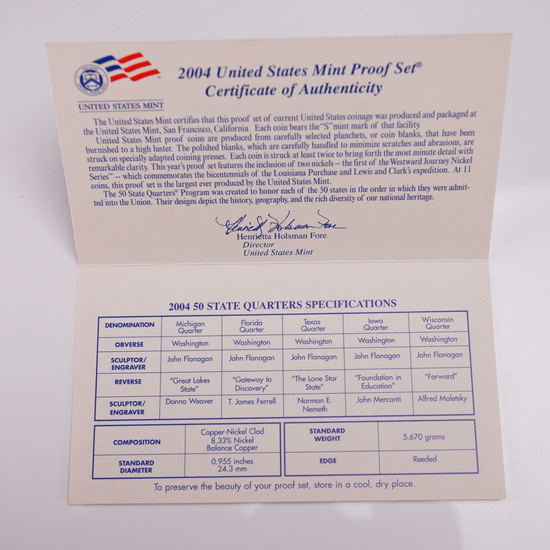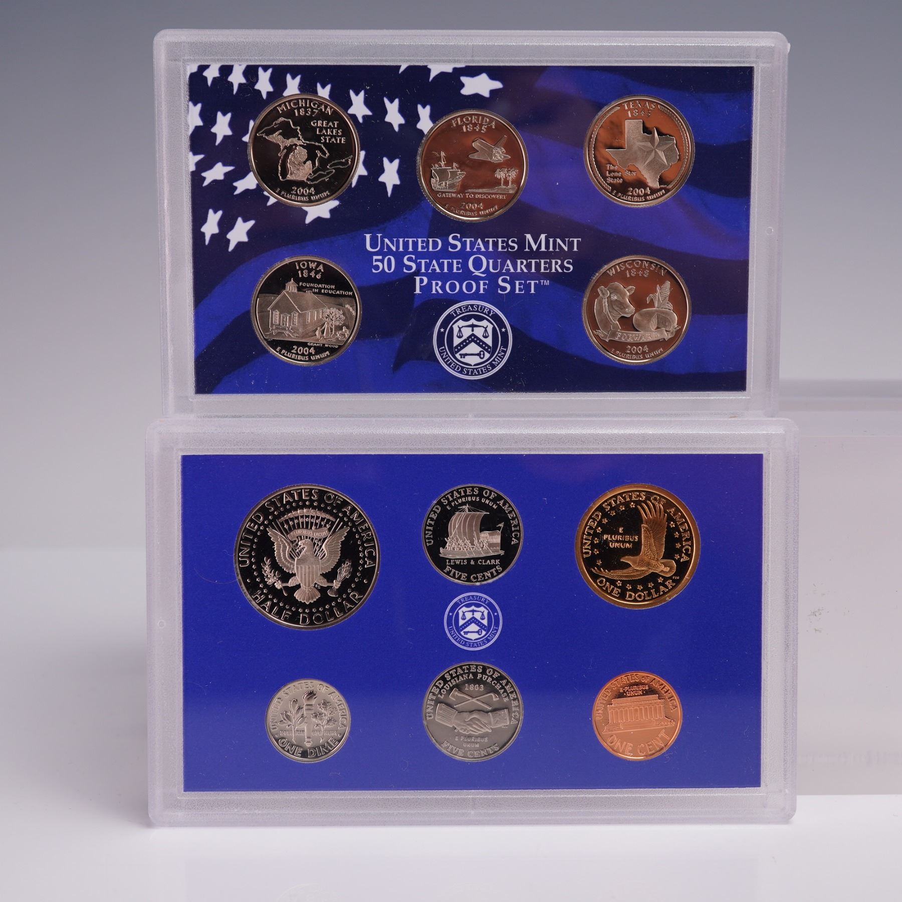 A 2004-S United States Mint Proof Set, containing 11 coins struck at the San Francisco Mint. The set includes the following denominations: Lincoln cent, Roosevelt dime, Kennedy half dollar, Sacagawea dollar, and two Westward Journey nickels featuring the Peace Medal and Keelboat reverse designs. Additionally, the set contains five State Quarters released in 2004: Michigan, Florida, Texas, Iowa, and Wisconsin. All quarters are struck in copper-nickel clad composition. Coins in this set were minted with a proof finish, intended to exhibit either a Cameo or Deep Cameo appearance. The set is presented in original U.S. Mint packaging with Certificate of Authenticity included. United States Mint box: 5.5"L x 3.5"W x 0.75"H.