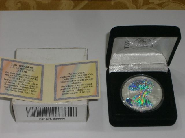 2004 SILVER EAGLE LIMITED MINTED *HOLOGRAM* SILVER EAGLE COMES IN ORIGINAL BOX/PACKAGE WITH CERTIFICATE OF AUTHENTICITY!! SILVER EAGLE CAME OUT OF SAFE BOX!! ***Coin, Currency & All Items Listed in this auction - Grades, Conditions and Values are not Safe Deposit Coins LLC Responsibilty. Grades, Condition and Values are determined by Consigner(s) & Buyers ONLY