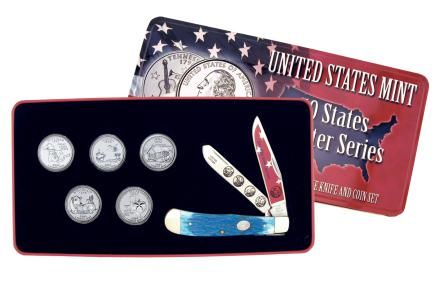SET INCLUDES ALL FIVES STATE QUARTERS AND A COMBINATION KNIFE WITH 2004 MARKED ON BOLSTER, PICTURES OF EACH STATE QUARTER ON THE BLADE, EST. $35.00 TO $45.00