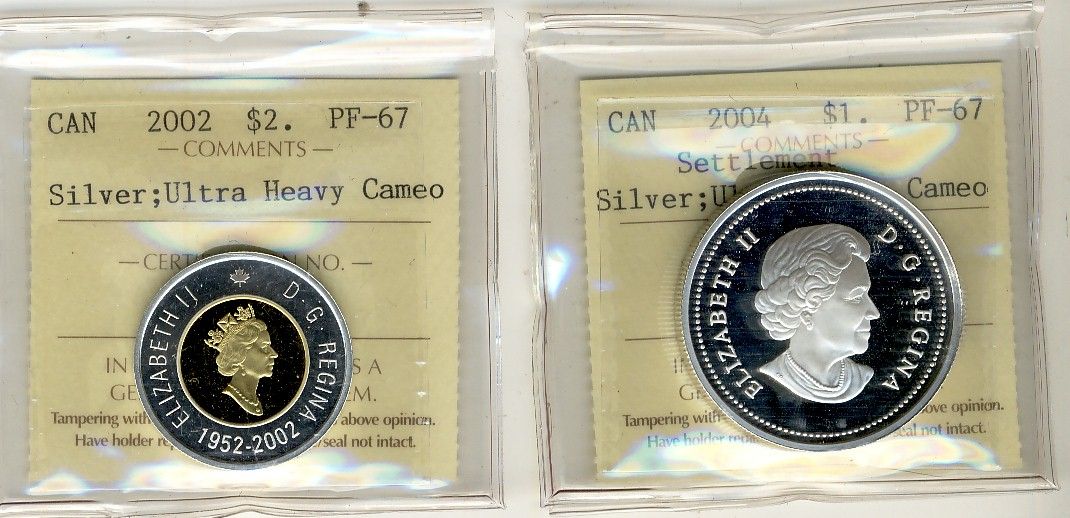 2004 Silv Settlement, 2 Dollars 2002 Silv 1 Dollars, ICCS PF67; Two coins.