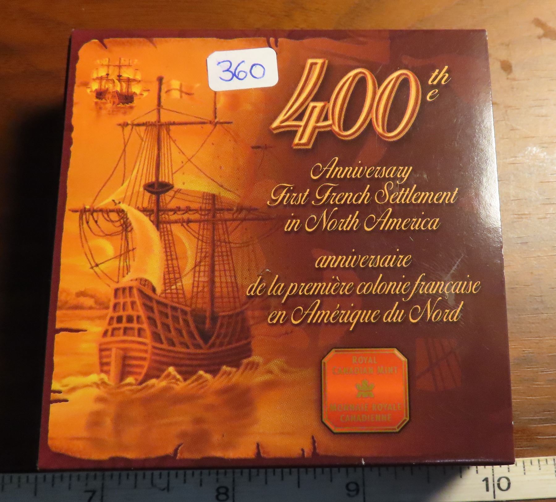 2004 Silver Dollar. Commemorates the 400th Anniversary of the first French settlement in North America. 99.99% pure Silver. Includes Certificate of Authenticity. Housed in its original Royal Canadian Mint case of issue. Brilliant Uncirculated.
