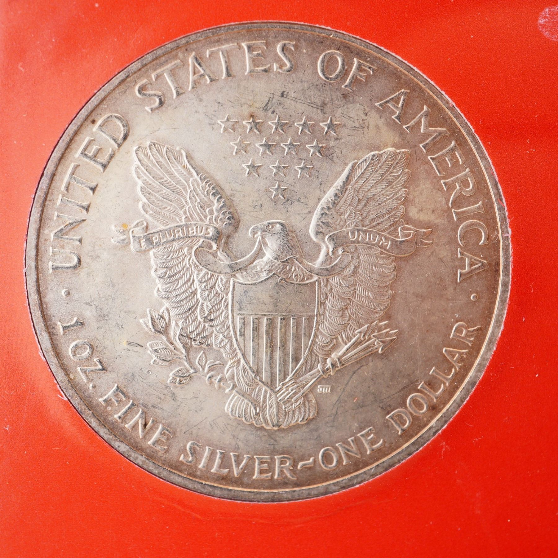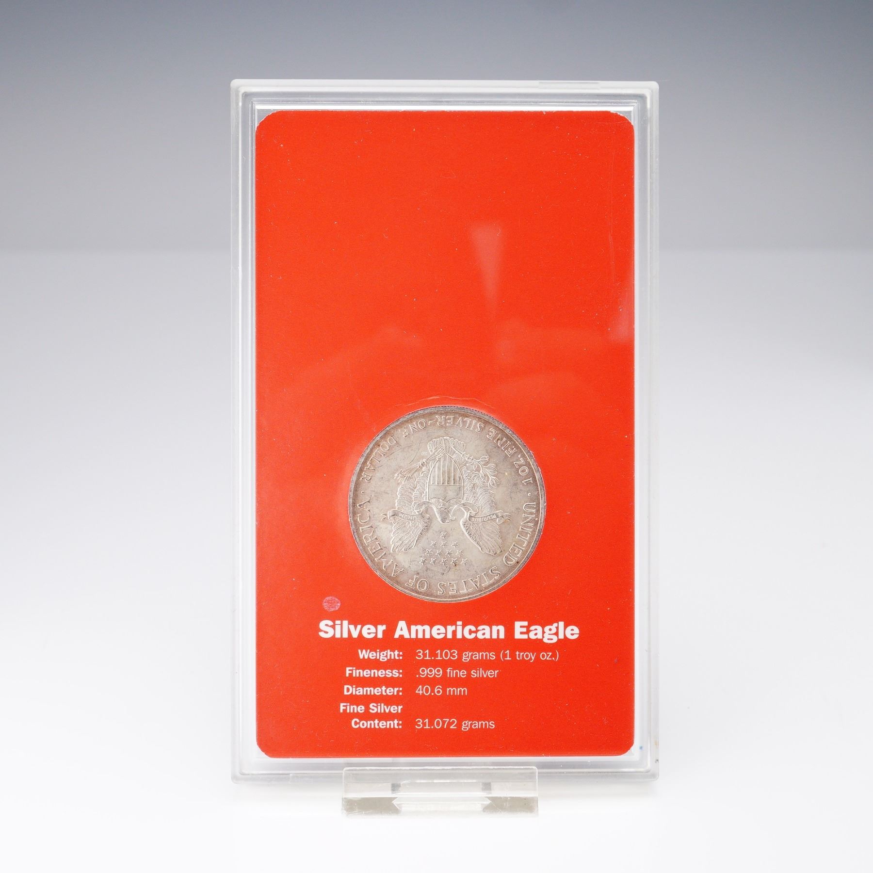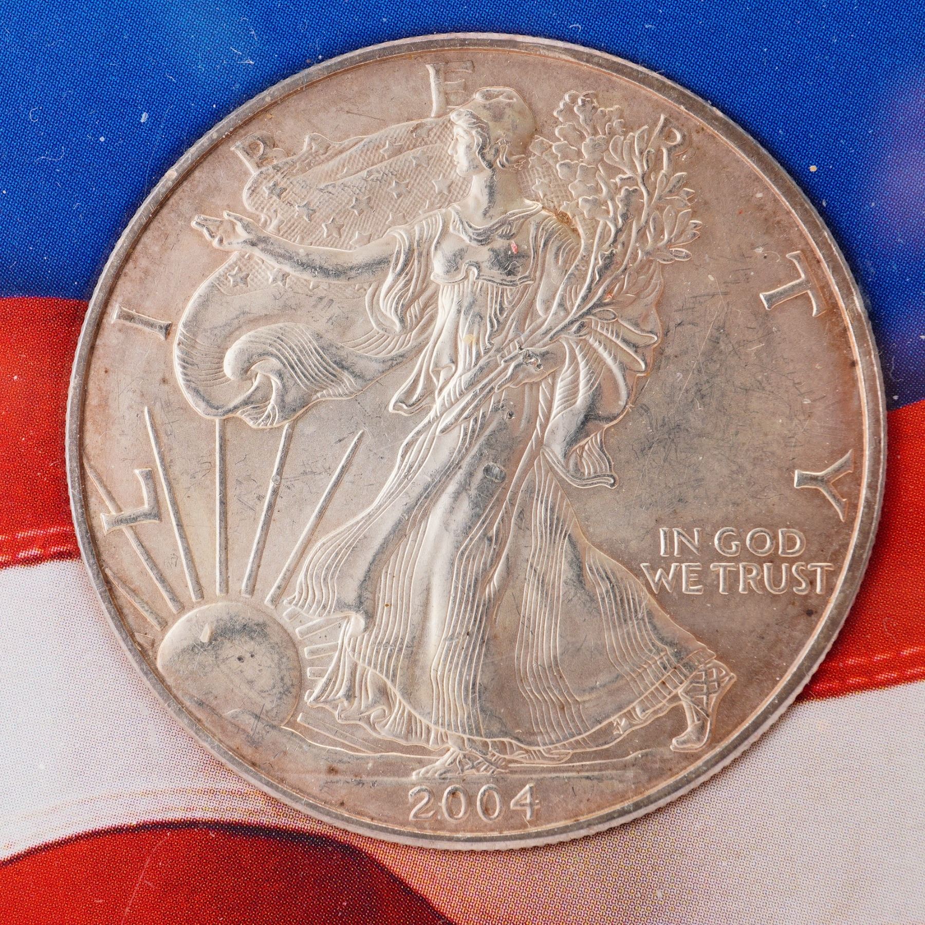 2004 American Eagle silver bullion coin struck by the United States Mint in 0.999 fine silver, weighing 1 troy ounce (31.103g). The obverse features the iconic Walking Liberty by Adolph A. Weinman, with Liberty cloaked in the U.S. flag and holding laurel and oak branches. The reverse, sculpted by John Mercanti, depicts a heraldic eagle with shield beneath a constellation of thirteen stars. This example is sealed in the original protective capsule with vibrant patriotic packaging and outer box from the American Eagle Program series. Coin diameter: 40.6mm. U.S. Box: 5.75"L x 3.5"H.