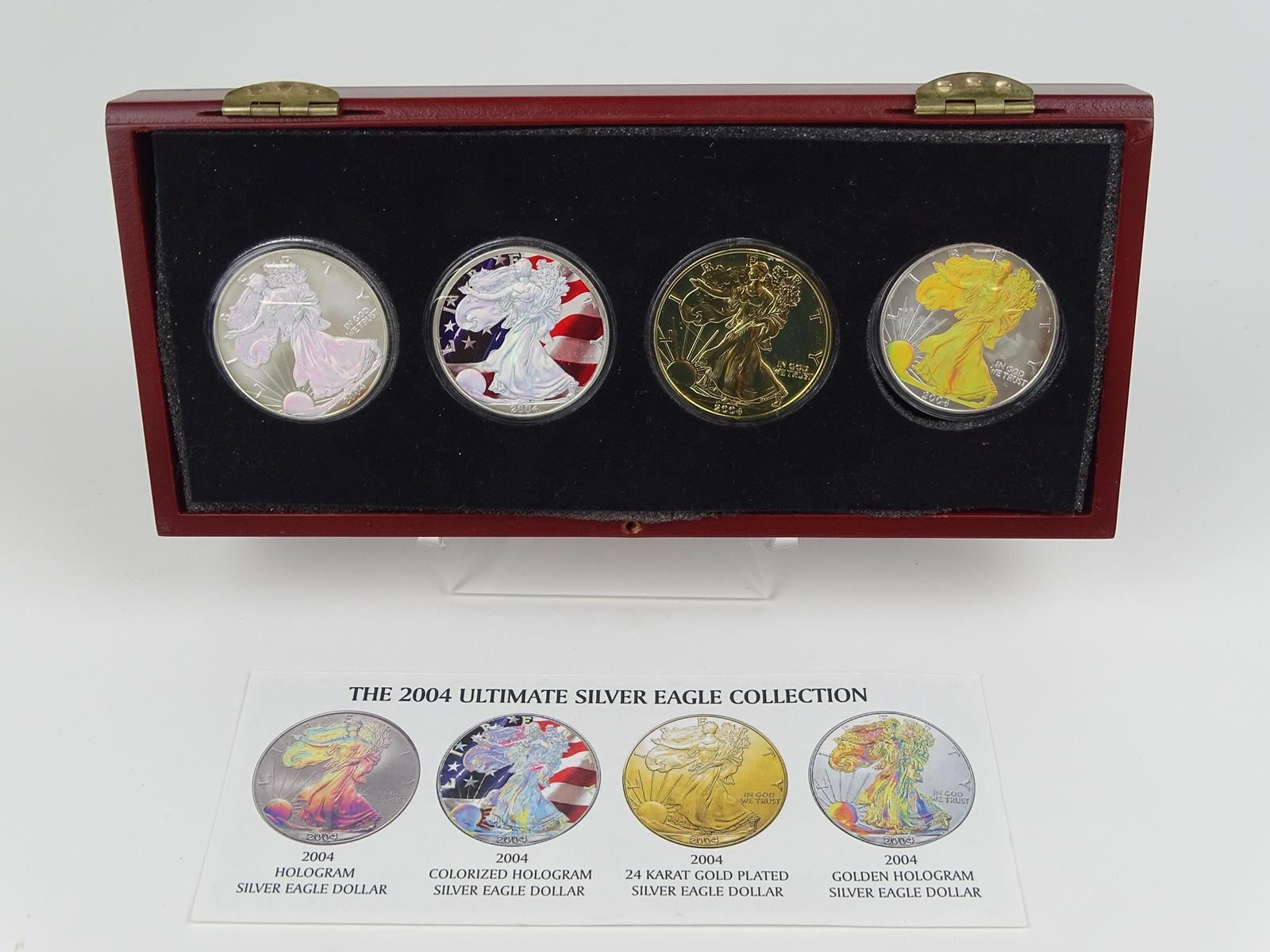 INCLUDES 4 SILVER EAGLES IN DIFFERENT PRESENTATION INCLUDING HOLOGRAM, COLORIZED HOLOGRAM, 24K GOLD PLATED, GOLDEN HOLOGRAM. ALL FOUR COINS ARE U.S. SILVER EAGLE, ONE OUNCE SILVER.