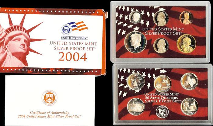 The Set contains 5 90% Silver Proof State Quarters, a 90% Silver Proof Half Dollar, a 90% Silver Proof Dime, as well as 4 additional Proof coins Including the Sacagawea Proof Dollar coin. Complete with Original Packaging and COA. Note* The set contains about 1 1/2 Ounces of Pure Silver. Estimated Value $65