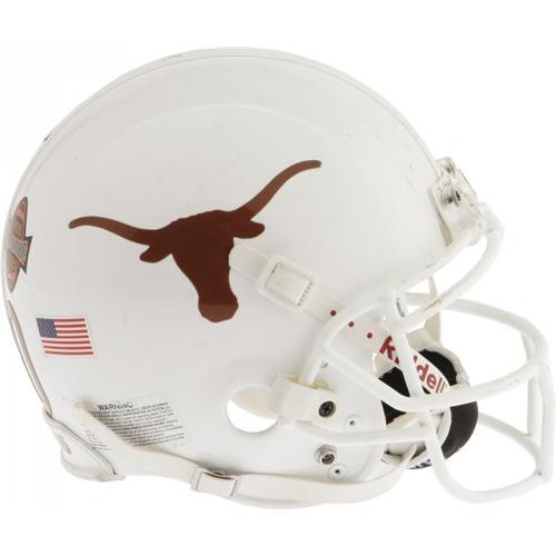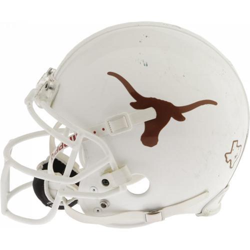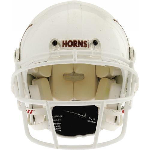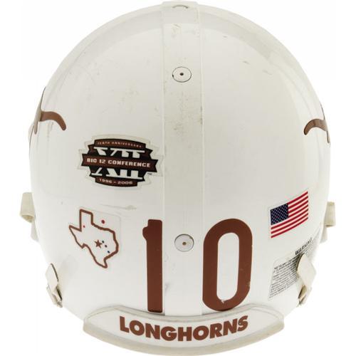 <B>2004 Vince Young Game Worn Helmet.</B></I> If you weren't a Vince Young fan before January 4, 2006, you certainly were afterwards. The Texas quarterback's valiant come-from-behind victory against a USC team that most of the football world believed to be unbeatable offered the sort of athletic drama usually confined to Hollywood films and childhood fantasies. Whether or not the greatest hero in Texas football history can make the transition to the NFL or not, Vince Young Longhorns memorabilia will never lose its luster. So here we're pleased and proud to present a Vince Young game worn helmet, sourced directly from the team, with their letter of provenance. This example was worn throughout the 2004 season, showing the sort of aggressive, take-no-prisoners wear that is uncommon for quarterback headgear, but expected of Young's. The facemask is gouged and stained with turf and dirt, and the shell is likewise abused, even showing transfer of green paint, likely from collisions with Baylor or Rice defenders. The interior "Riddell VSR-4" padding shows strong wear as well, and the original chinstrap is still affixed, with Young's standard black chinstrap cover. The array of decals on the back of the shell assure beyond any doubt that this is the genuine article, as the State of Texas and "Longhorns" decals were never made available to the public. The former is switched out after every win, with a dot added for the location of each vanquished foe. Here we can see that Texas Tech, the University of North Texas, Baylor, Texas A&M and Rice were hooked by the Horns. Young's number "10" straddles the center stripe, with the "Bowl Championship Series" decal above, designating this as Young's back-up for the 2005 Rose Bowl. Standard American flag and warning sticker labels to the right help to photo match the helmet, as we have done. Printed copies of these matches will accompany the lot. <I>LOA from Lou Lampson. Team letter of provenance.</B></I> <BR><BR><B>Important notice:</B> Heritage usually auctions material at the rate of 200-250 lots per hour. On some occasions eBay Live bid software or the Internet may not be able to keep up with the pace of the auction. We recommend placing a realistic absentee bid now as insurance to avoid disappointment. Occasionally the auctioneer may eliminate or reject an eBay Live bid, and the auctioneer may also reopen a lot after the close of the eBay live bidding (usually because we missed an audience bid), and may reject your bid even if it shows you as the winning bidder. By bidding via eBay Live, you agree that Heritage may award the lot to another bidder at its sole discretion under the circumstances described above or any other reasonable circumstances. Since eBay bids are not shown to us until we open the lot on the floor, we treat those bids just like floor bids. In most cases the floor responds before the eBay bid is presented to us, due to Internet lag time, so for consistency we have made it a policy that floor bids are always considered first over tie eBay live bids. Also please note that all Heritage lots purchased through eBay Live carry a 22.5% Buyer's Premium. Please make sure you read the Terms and Conditions before you bid. This lot is being auctioned in conjunction with a live floor auction by Heritage Galleries & Auctioneers. All final auction and invoice information will be supplied by Heritage Galleries & Auctioneers, and all other information should be considered preliminary. Lot:19333 <BR><BR><B>Winning Notification and Billing:</B> After the FINAL session in this auction is complete, Heritage will send e-mail and snail mail invoices. This process normally takes several days. All final auction and invoice information will be supplied by Heritage Galleries & Auctioneers, and all other information should be considered preliminary. <BR><BR>This auction will be conducted on a live auction floor and over the Internet through eBay Live. If you choose to place an absentee bid, please take a moment to <font color='#0000ff'><u><a href='http://pages.ebay.com/liveauctions/help/before/laabsentee.html'>learn how eBay Live absentee bidding works</a></u></font><font color='#000000'>
