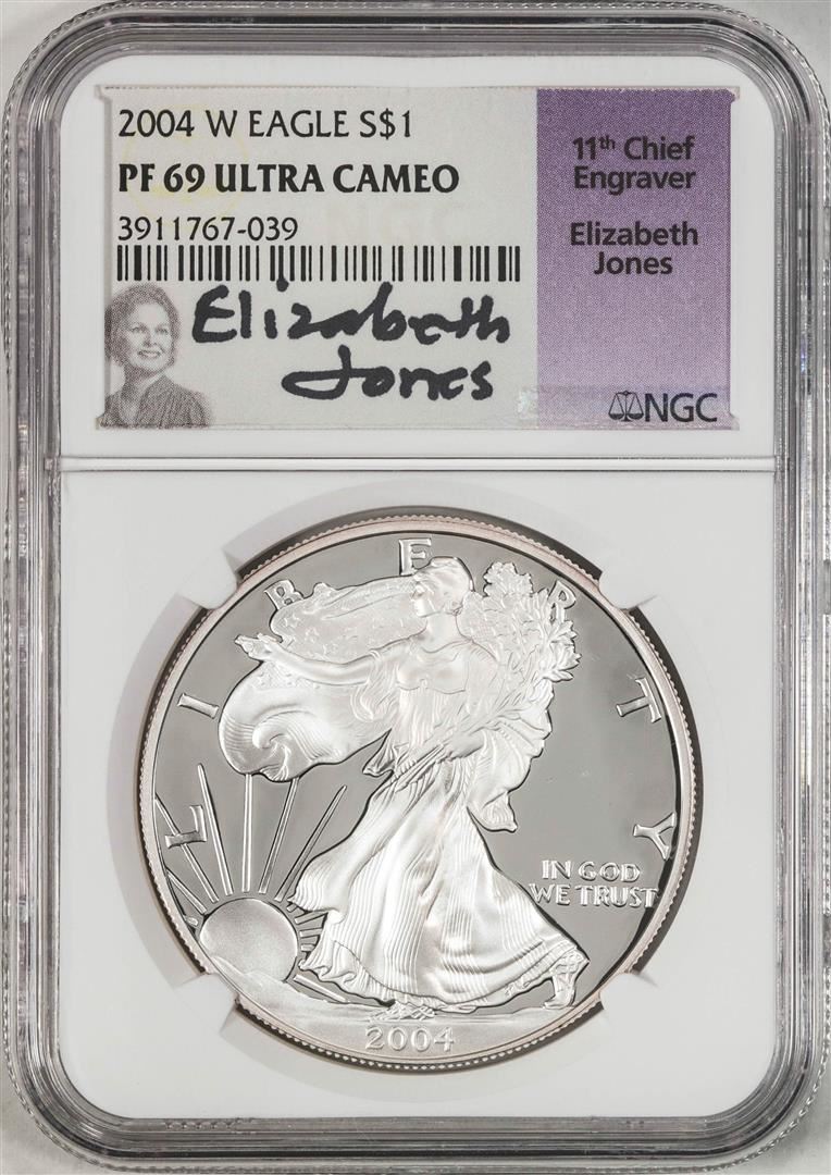One 2004-W $1 Proof American Silver Eagle Coin NGC PF69 Ultra Cameo Elizabeth Jones Signature. NGC Certified.