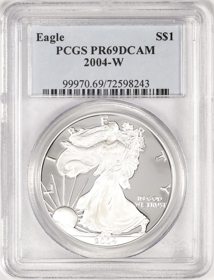 One 2004-W $1 Proof American Silver Eagle Coin PCGS PR69DCAM. PCGS Graded.