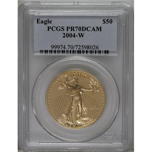 <B>2004-W $50 One-Ounce Gold Eagle PR70 Deep Cameo PCGS.</B></I> An immensely appealing, recent one-ounce example. The exquisite perfection of this one-ounce proof puts it at the pinnacle of the modern coiner's art. PCGS has graded only 36 pieces at this level (2/07).<BR><BR><b>Shipping:</b> Coins & Currency (<a target="_blank" href="http://www.heritageauctions.com/common/shipping.php">view shipping information</a>)