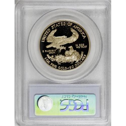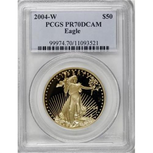 <B>2004-W $50 One-Ounce Gold Eagle PR70 Deep Cameo PCGS.</B></I> Beautifully frosted and deeply mirrored, an impressive and technically perfect American Eagle from recent Mint history. One of just 49 pieces assigned this ultimate grade by PCGS (1/08).<BR><BR><b>Shipping:</b> Coins & Currency (<a target="_blank" href="http://www.heritageauctions.com/common/shipping.php">view shipping information</a>)