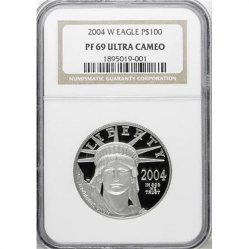 <B>2004-W P$100 One-Ounce Platinum Eagle PR69 Ultra Cameo NGC.</B></I> The richly frosted, decisively struck devices offer excellent contrast with the fathomless fields. Even under magnification, the flaw that keeps this piece from pure perfection is difficult to perceive.<BR><BR><b>Shipping:</b> Coins & Currency (<a target="_blank" href="http://www.heritageauctions.com/common/shipping.php">view shipping information</a>)