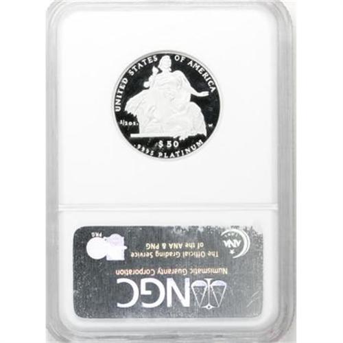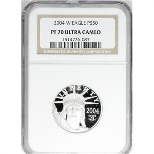 <B>2004-W P$50 Half-Ounce Platinum Eagle PR70 Ultra Cameo NGC.</B></I> An absolutely perfect Ultra Cameo proof example of this modern bullion issue. Both sides have exceptional mirrored fields framing lustrous devices, with outstanding eye appeal. For the connoisseur who appreciates the finest available quality.<BR><BR><b>Shipping:</b> Coins & Currency (<a target="_blank" href="http://www.heritageauctions.com/common/shipping.php">view shipping information</a>)