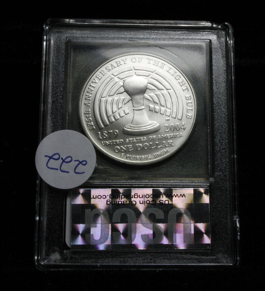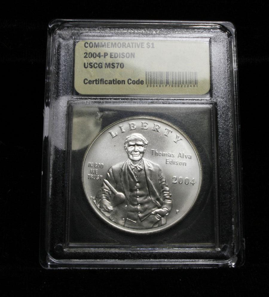 The 2004 Thomas Alva Edison Silver Dollar was issued to mark the 125th anniversary of the famous inventor's successful demonstration of the electric light bulb, which had occurred on October 21, 1879. Encapsulated and Graded ms70 by USCG. PCGS lists the ms70 at $500. Estimated Value $125