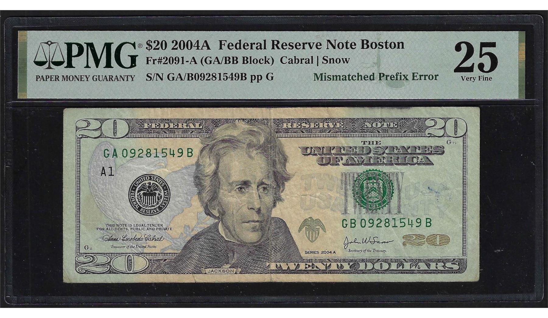 One 2004A $20 Federal Reserve Note Mismatched Prefix Error Fr.2091-A PMG Very Fine 25. PMG Certified.
