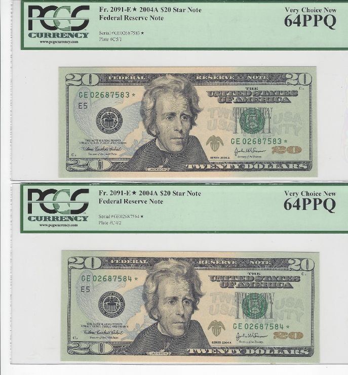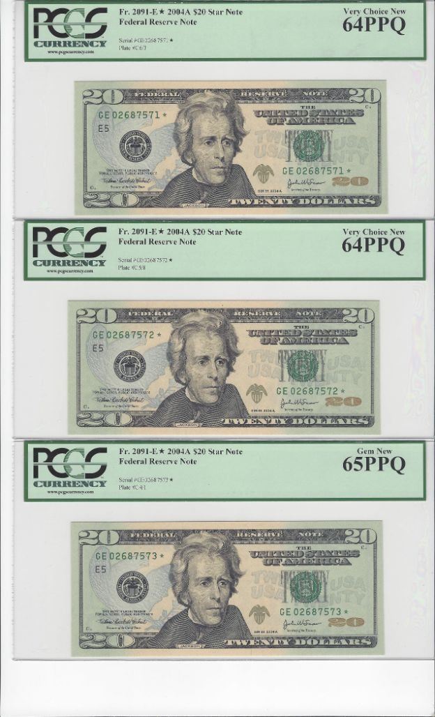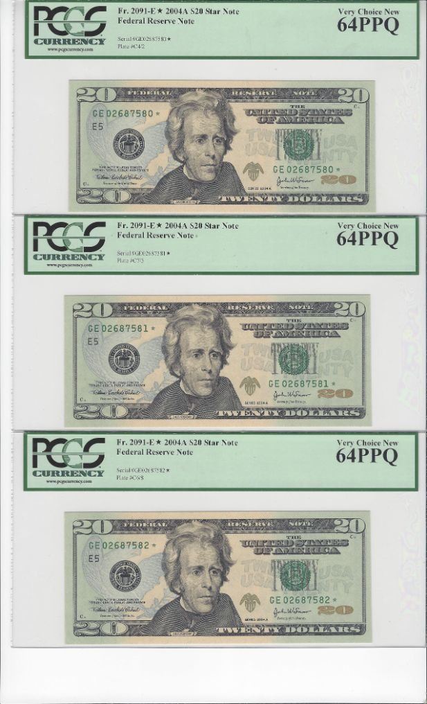 Excellent 23 consecutive run of $20 2004A Federal Reserve STAR replacement notes. Graded in 66, 65, and 64 Gem New and Very Choice New. These are from the Richmond block. These notes are very hard to come across that are not in uncut sheet format.
