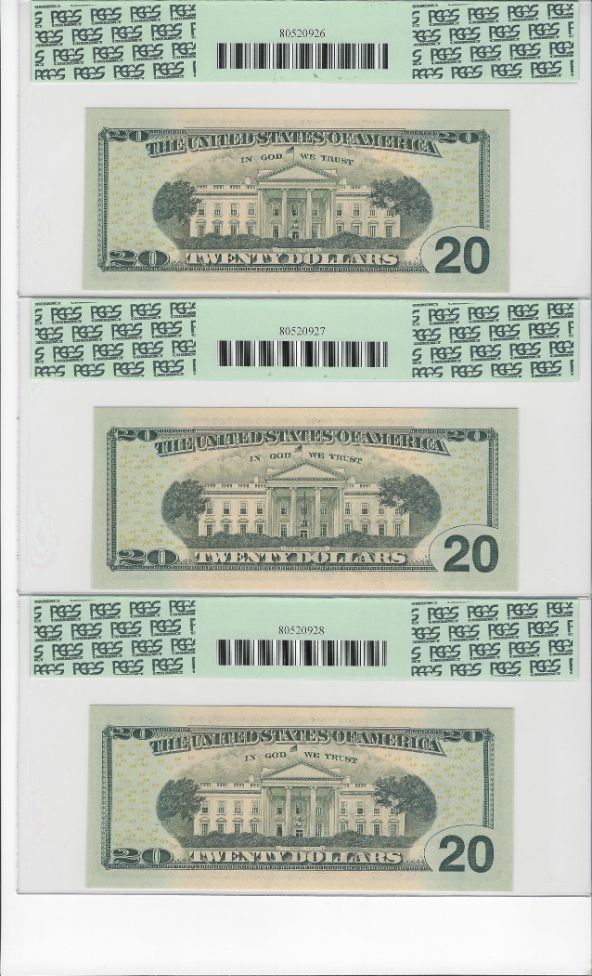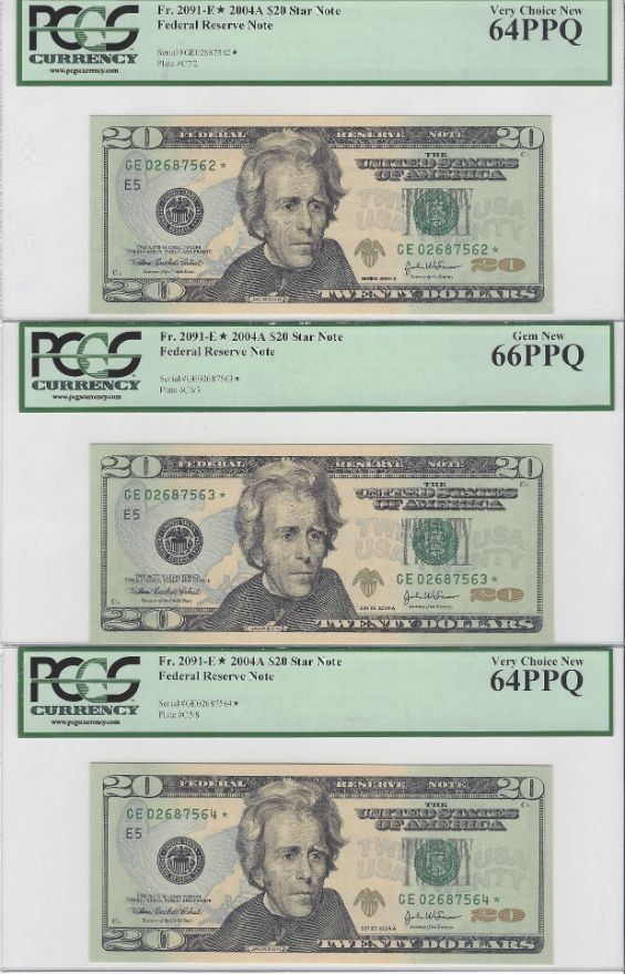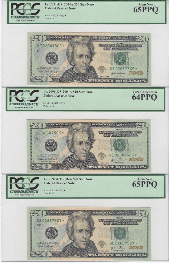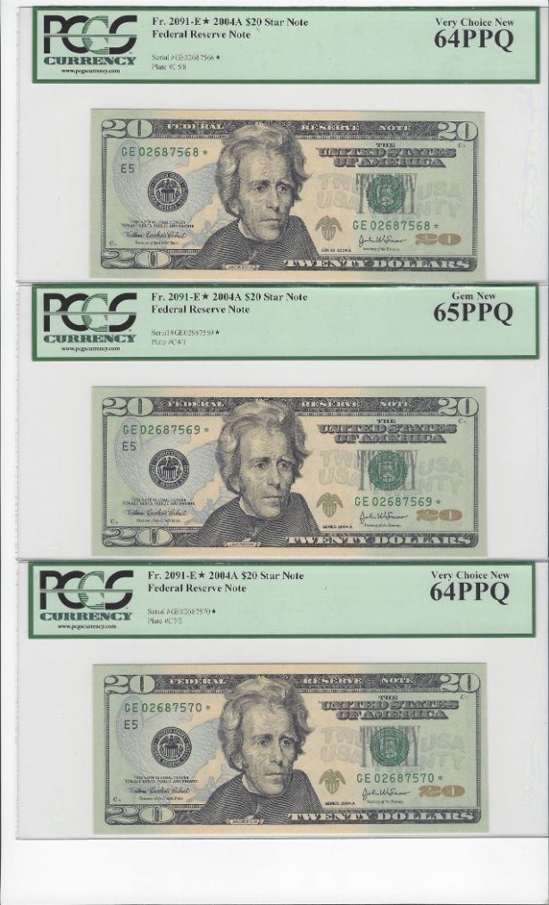 Excellent 23 consecutive run of $20 2004A Federal Reserve STAR replacement notes. Graded in 66, 65, and 64 Gem New and Very Choice New. These are from the Richmond block. These notes are very hard to come across that are not in uncut sheet format.