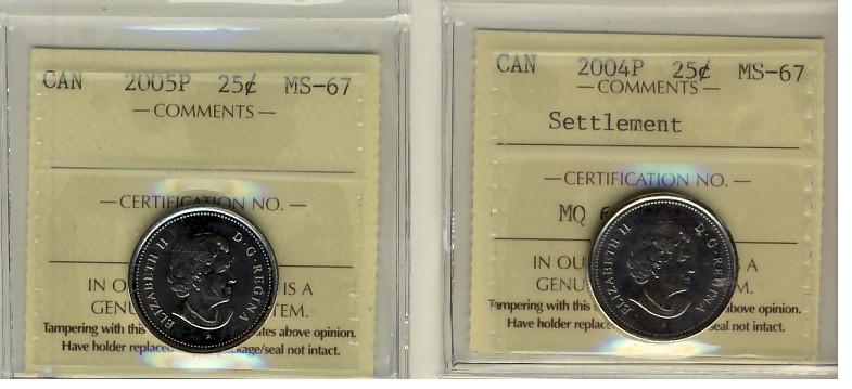 2004P & 2005P ICCS MS67. Lot of 2 coins.