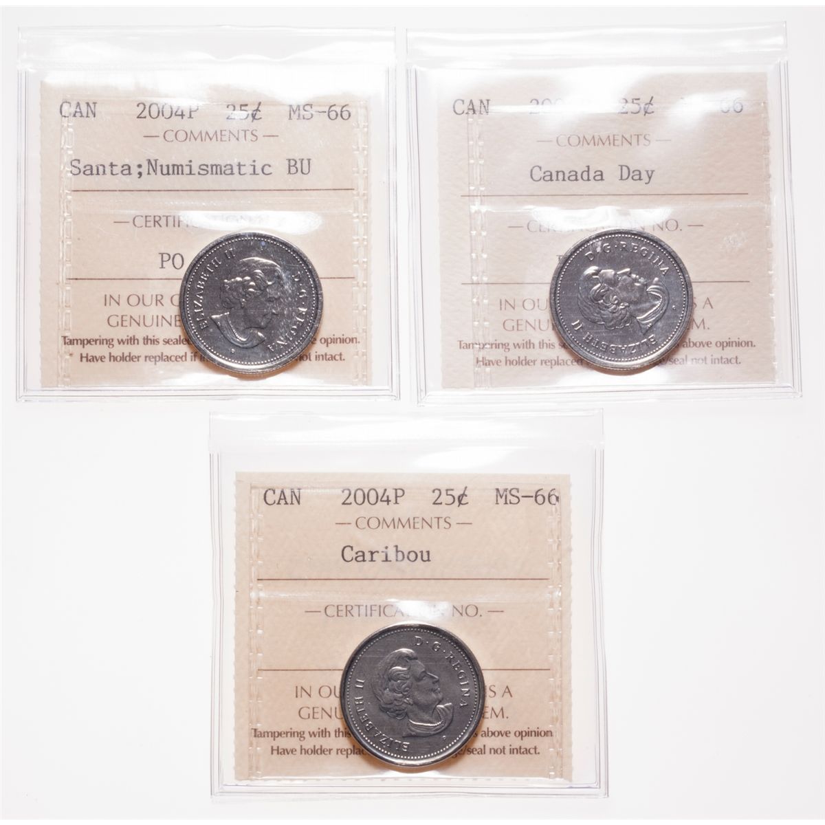 2004P. Caribou. ICCS Mint State-66. Tied for the 'Finest' certified by ICCS; 2004P. Canada Day. ICCS Mint State-66. Tied for the fourth 'Finest' certified by ICCS; 2004P. Santa. ICCS Numismatic BU-66. Lot of three (3) Gems.