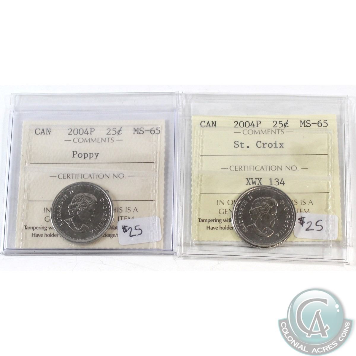 2004P St. Croix & 2004P Poppy 25-cent ICCS Certified MS-65. 2pcs.