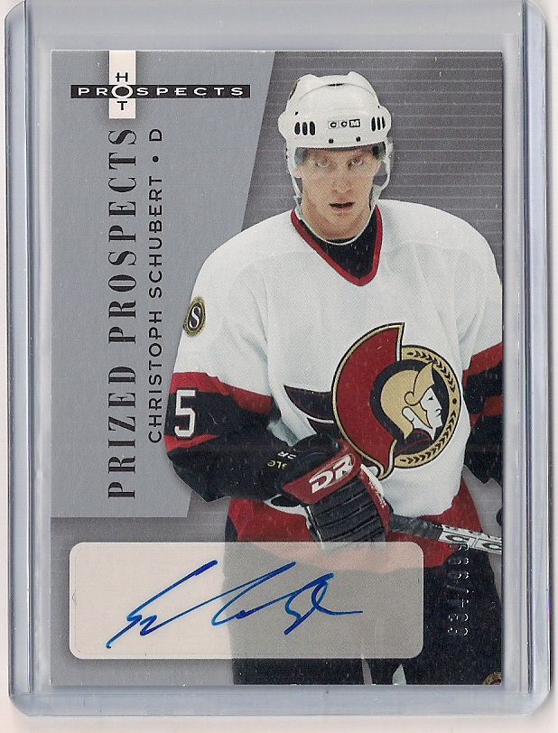 2005-06 Hot Prospects Christopher Schubert Autographed Rookie Insert Card. This Rookie Insert is signed in Blue Sharpee and is serial numbered 634/999! Card is Near Mint.