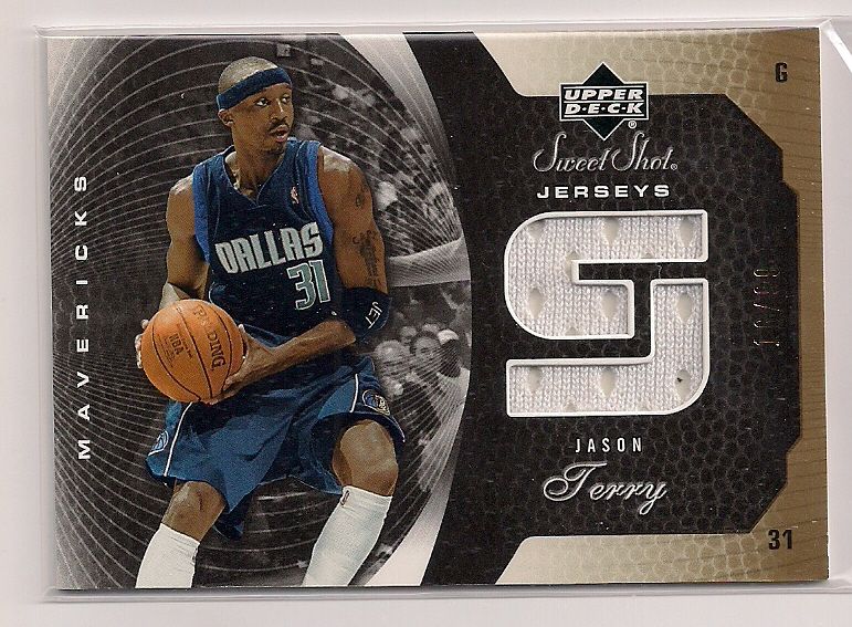 2005-06 Sweet Spot Jerseys Jason Terry Game-Worn Jersey Insert Card. This Insert features a Solid White piece of Game-Worn Jersey, and is serial numbered 16/99! Card is Near Mint.