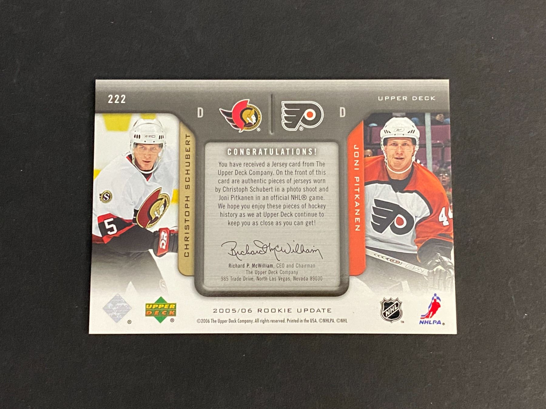 2005-06 UPPER DECK ROOKIE UPDATE JONI PITKANEN & CHRISTOPH SCHUBERT N.H.L DUAL JERSEY CARD